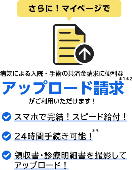 アップロード請求とは、ご加入状況やご請求内容により、必要書類をアップロードすることで共済金をご請求いただけるサービスです。