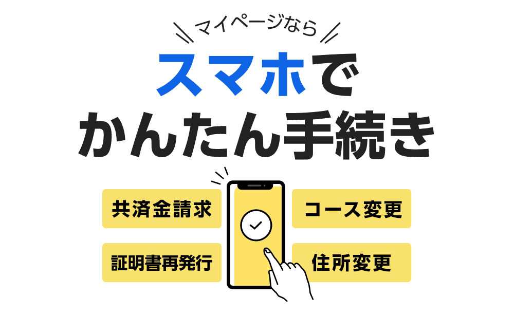 マイページとは、当共済にご加入いただいている方が、インターネットでご自身の情報を確認したり、各種変更手続きや証明書等の再発行、共済金請求を行えるサービスです。